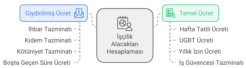 Genelde çalışanın, hak ettiği ücret niteliğindeki işçilik alacaklarında ise Temel (Kök) Ücreti dikkate alınarak hesaplama yapılacaktır. Bu ücret üzerinden hesaplanması gereken işçilik alacakları;